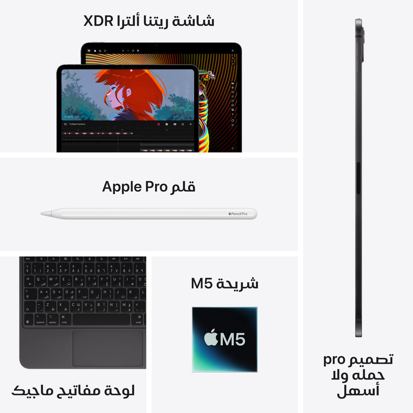يقدم جهاز iPad Pro، المدعوم بشريحة Apple M5، أداءً خرافياً لإنتاجية فائقة بلا مجهود ومهام ذكاء اصطناعي متقدمة. فبفضل شاشة ريتنا ألترا XDR المذهلة، وشبكة Wi-Fi 7 فائقة السرعة وشبكة 5G للاتصال الخلوي، والمسرّعات العصبية المخصصة لمهام الذكاء الاصطناعي، ونظام iPadOS بتصميمه الجديد، لا حدود لما يمكن تحقيقه مع iPad Pro. وعندما يقترن بقلم Apple Pro ولوحة مفاتيح ماجيك لجهاز iPad Pro، ستتدفق أناملك تنوعاً وإبداعاً وإنتاجيةً بلا حدود.