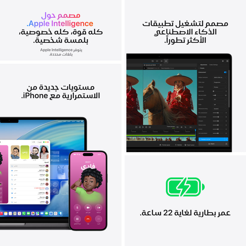 مصمم حول الذكاء الاصطناعي — صُممت شريحة Apple silicon وكل المكونات الرئيسية التي تدعمها لتشغيل مهام الذكاء الاصطناعي التي تتطلب أداءً قوياً على الجهاز مثل استدلال النماذج اللغوية الكبيرة وتدريبها.
