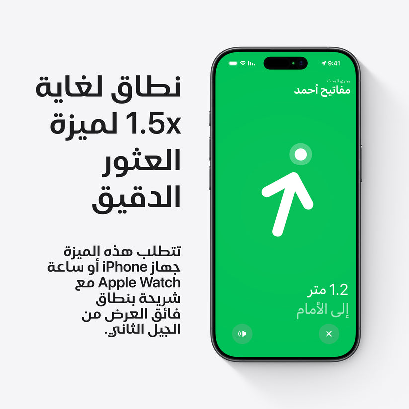 نطاق أوسع لميزة العثور الدقيق في iPhone و Apple Watch- احصل على إرشادات خطوة بخطوة للوصول إلى غرضك المفقود على iPhone, و الان على Apple Watch أيضاً. مكبر صوت معزز - أصبح سماع AirTag و العثور عليه أسهل مما كان بفضل مكبر صوت أقوى بنسبة 50% و رنين مميز جديد.