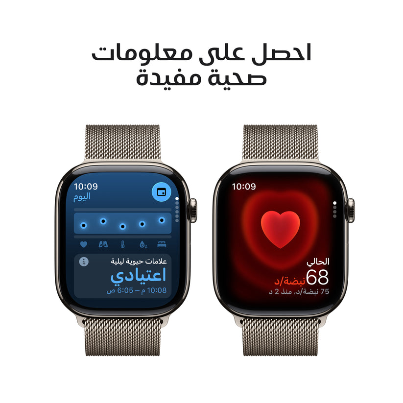 معلومات أكثر وأشمل عن صحتك — احصل على تخطيط للقلب في أي وقت. استلم إشعارات في حالة ارتفاع معدل نبض القلب أو انخفاضه، واضطراب النَّظْم، وانقطاع النفس النومي المحتمل. اطّلع على بياناتك الصحية الليلية في تطبيق العلامات الحيوية5 واحصل على قراءات لمستوى الأكسجين في دمك.