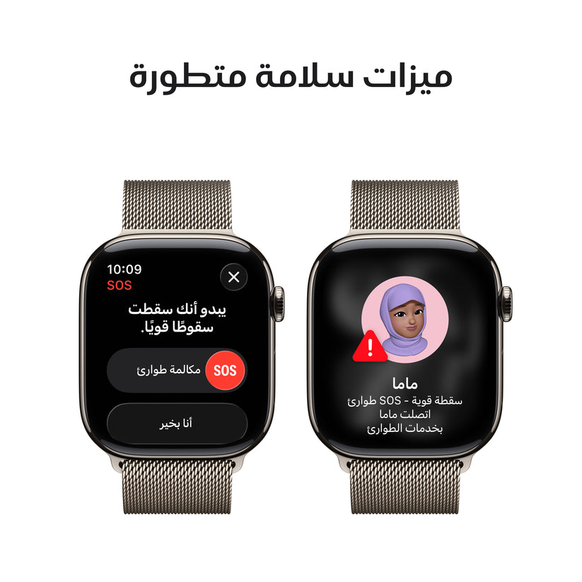 ميزات السلامة — تستطيع Series 11 اكتشاف تعرضك لسقوط قوي أو لحادث سيارة خطير، ويمكنها تلقائياً المساعدة في الاتصال بخدمات الطوارئ وإبلاغ الأشخاص الذين حددتهم كجهات اتصال للطوارئ. تستطيع ميزة الاطمئنان إرسال إشعار تلقائي إلى أحد أحبائك ينبهه بوصولك إلى وجهتك.