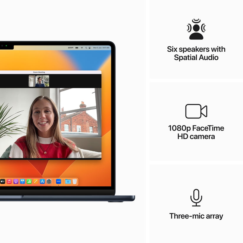 شريحة M2 للأداء المذهل وحدة المعالجة المركزية 8-Core وما يصل إلى 10 كوور من وحدة معالجة الرسومات لتشغيل المهام المعقدة محرك عصبي 16-Core لمهام التعلم الآلي المتقدمة ما يصل إلى 24 جيجابايت من الذاكرة الموحدة يجعل كل ما تفعله سريعًا وسائلًا أسرع بنسبة تصل إلى 20 في المائة لتطبيق مرشحات الصور وتأثيراتها أسرع بنسبة تصل إلى 40 في المائة لتحرير الجداول الزمنية للفيديو المعقدة اذهب طوال اليوم مع 18 ساعة من عمر البطارية تصميم بدون مروحة للتشغيل الصامت شاشة Liquid Retina سائلة بحجم 15.3 إنش مع 500 مجموعة من السطوع ولون P3 عريضًا للصور النابضة بالحياة والتفاصيل المذهلة كاميرا HD 1080p صفيف ثلاثي الميكروفون يركز على صوتك بدلاً من ما يجري من حولك نظام صوت من ستة مكبرات صوت مع صوت مكاني لتجربة الاستماع الغامرة Magsafe 3 منفذ، ومنفذين صاعقة، ومقبس سماعة الرأس لوحة المفاتيح السحرية الخلفية ومعرف اللمس لإلغاء القفل الآمن والمدفوعات اتصال سريع Wi-Fi 6 اللاسلكي يقوم Ssd Ssd Storage بتشغيل التطبيقات ويفتح الملفات في لحظة يمنحك MacOS Ventura طرقًا قوية لإنجاز المزيد والمشاركة، والتعاون - ويعمل بشكل رائع مع iPhone و iPad متوفر في منتصف الليل، ضوء النجوم، Space Gray، والفضي