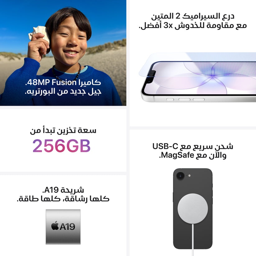 يأتيك iPhone 17e بشاشة ريتنا سوبر XDR مقاس 6.1 إنش، وشريحة A19 سريعة وقوية، وبطارية تدوم طوال اليوم، وسعة تخزين تبدأ من 256GB.