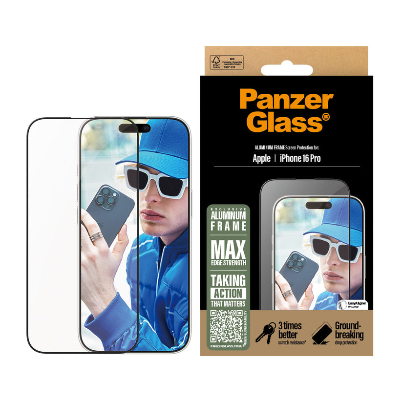Strong, sophisticated and … well … just beautiful! This PanzerGlass® screen protector with exclusive aluminium frame is sure to make heads turn and jaws drop. Combining high-end elegance with max edge strength, groundbreaking drop protection and high-level scratch resistance, this screen protector is as stylish as it is strong. It is even made of 60% recycled glass and equipped with a smudge-free coating that reduces traces of fingerprints and grease.