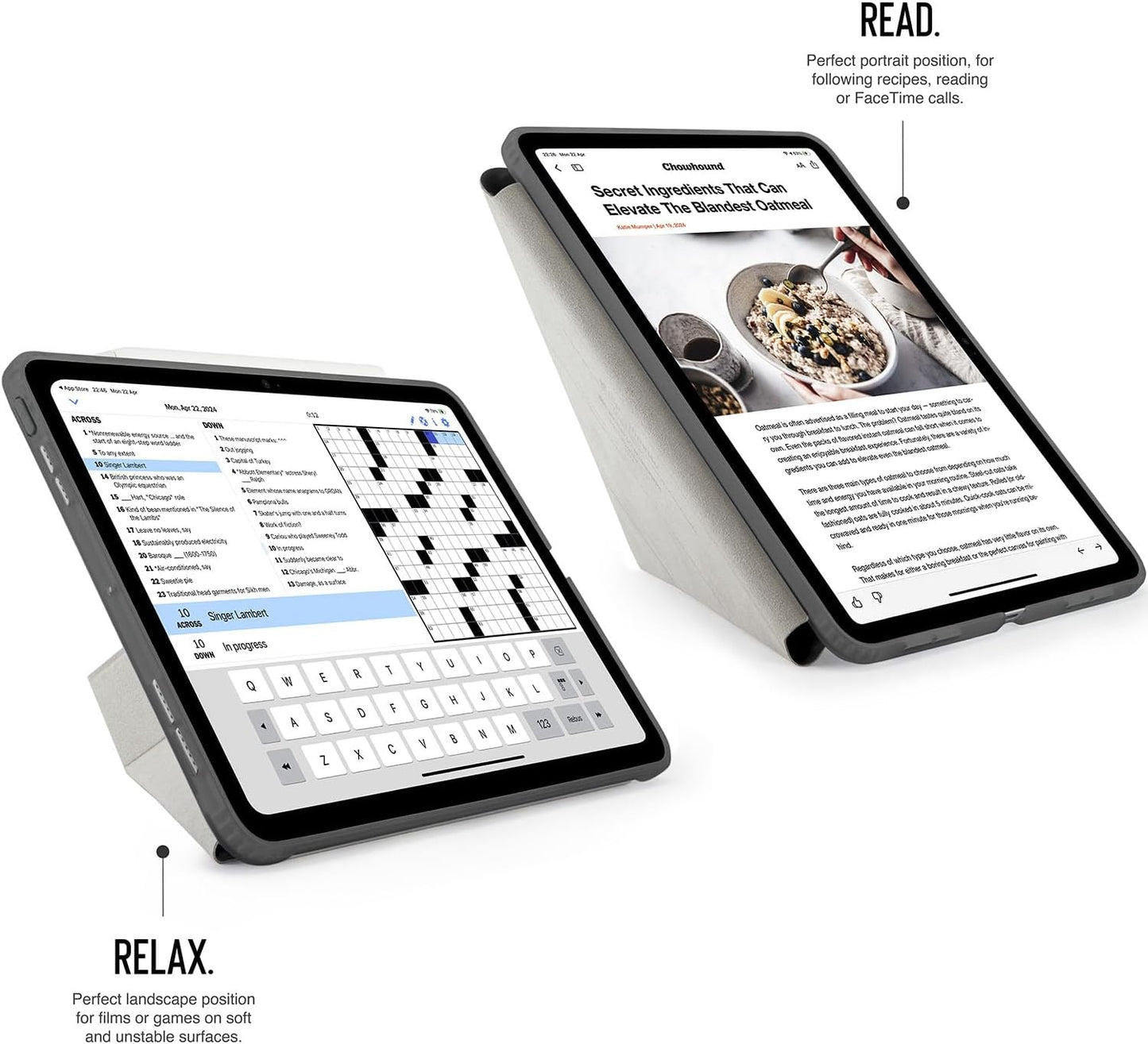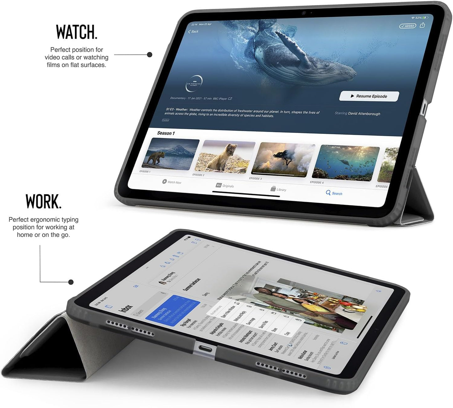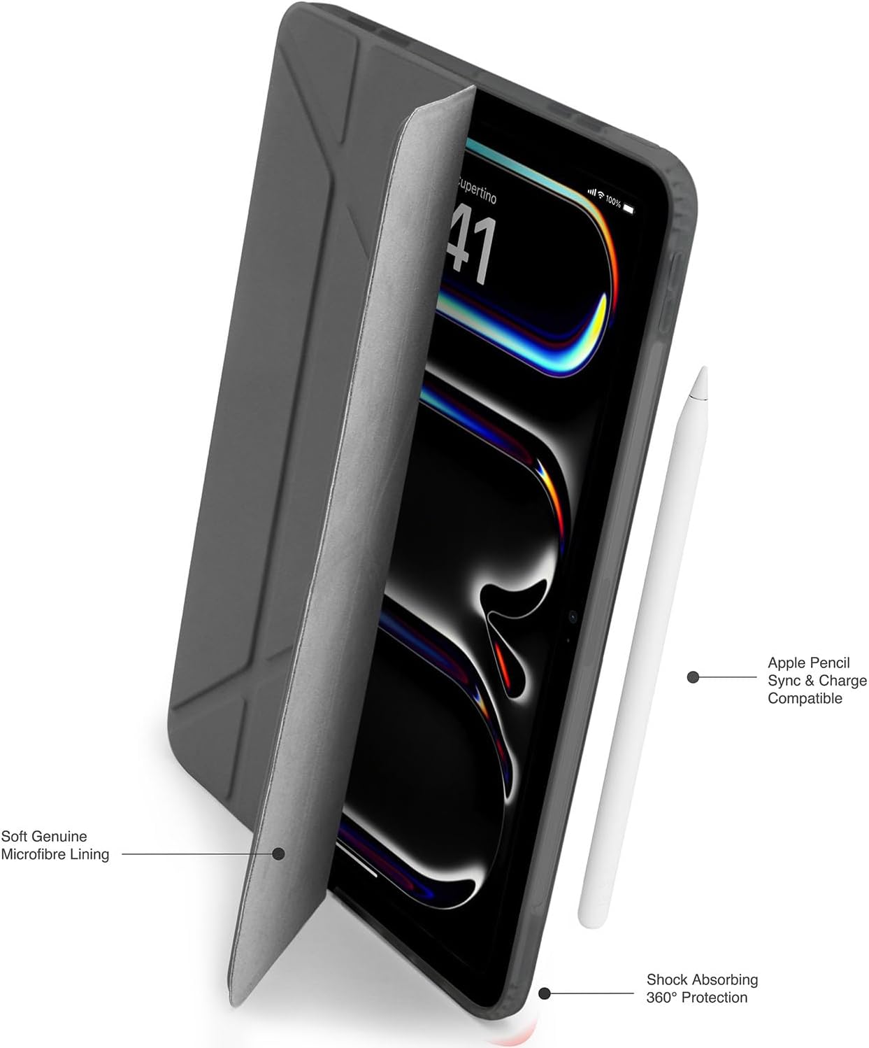 توفر هذه الحافظة متعددة الاستخدامات 5 في 1 خيارات عرض متعددة، بما في ذلك موضعان للكتابة والعرض، وموضعان إضافيان للقاعدة العريضة، ووضع عمودي. تم تصميمه من أجل المتانة، حيث يمتص محيطه الواقي المصنوع من مادة TPU الصدمات والسقوط مع توفير حماية كاملة. متوافق تمامًا مع Apple Pencil Pro وApple Pencil (USB-C)، فهو يضمن الأداء السلس. مصنوع من مواد فاخرة، ويتميز التصميم خفيف الوزن بنسبة 100% من البولي يوريثان النباتي، وبطانة فاخرة من الألياف الدقيقة، وظهر شفاف من البولي كربونات لإضفاء الطابع الشخصي. بالإضافة إلى ذلك، تساعد وظيفة النوم والتنشيط التلقائي على إطالة عمر البطارية بنسبة تصل إلى 20%.