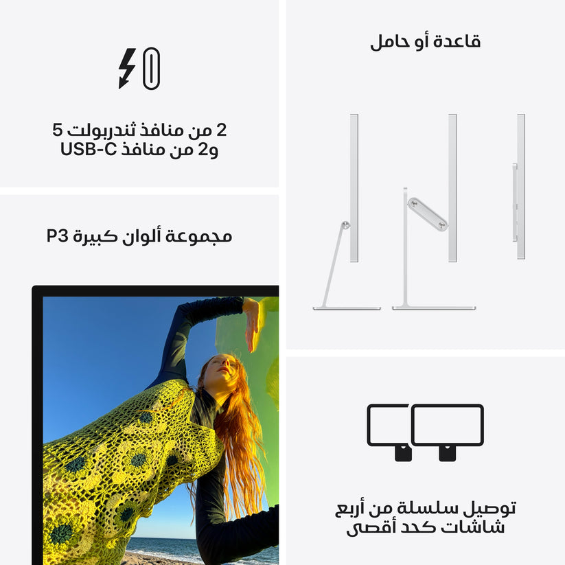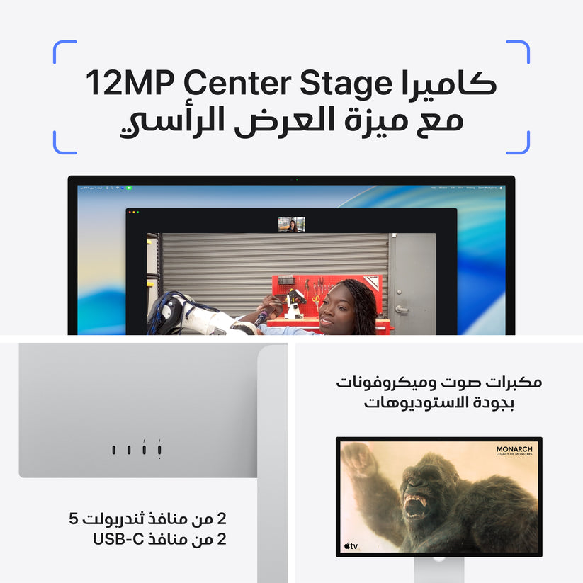 شاشة Studio Display هي الشريك المثالي لجهاز Mac. يمكن للموظفين إعداد مساحة عملهم المثالية مع شاشة ريتنا 5K غامرة مقاس 27 إنش، وكاميرا 12MP Center Stage مع ميزة العرض الرأسي، وميكروفونات ومكبرات صوت متطورة، ومنافذ ثندربولت5.