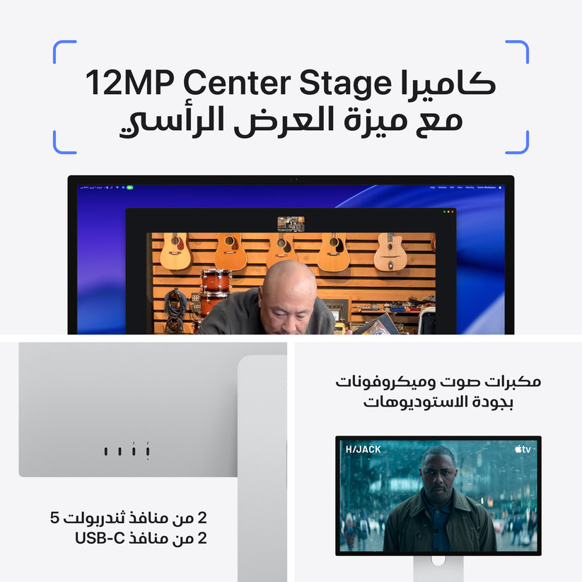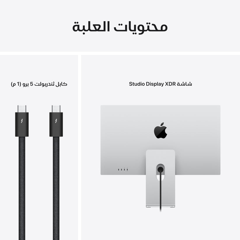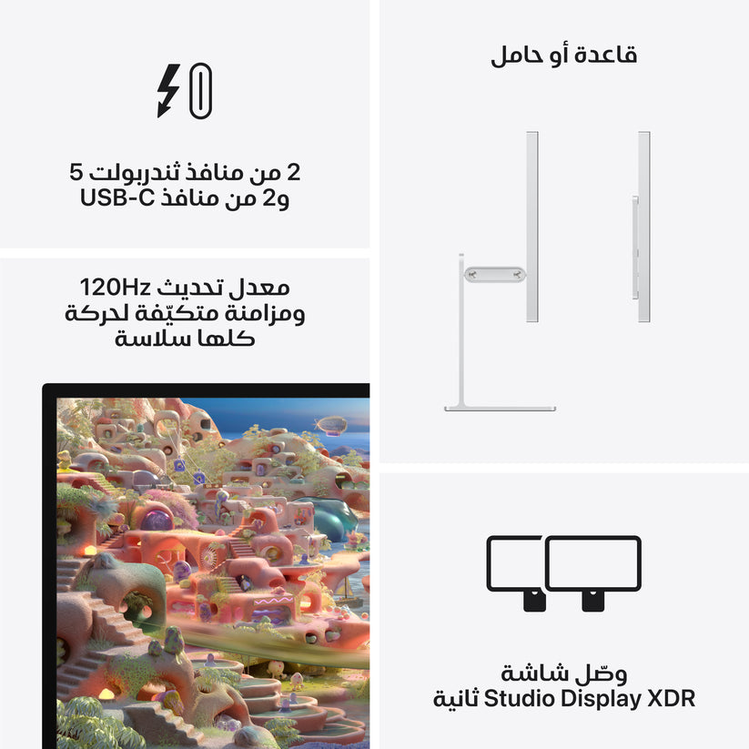 شاشة ريتنا XDR 5K مقاس 27 إنش ترتقي بالسطوع والألوان وسرعة الاستجابة إلى مستويات جديدة. ومع قدرات ثندربولت 5 قوية وكاميرا متطورة، ومصفوفة من ثلاثة ميكروفونات، ونظام صوت من ستة مكبرات، تعدّ شاشة Studio Display XDR الأمثل للمحترفين مثل صناع الأفلام والمصممين والمصورين ومطوري الألعاب.