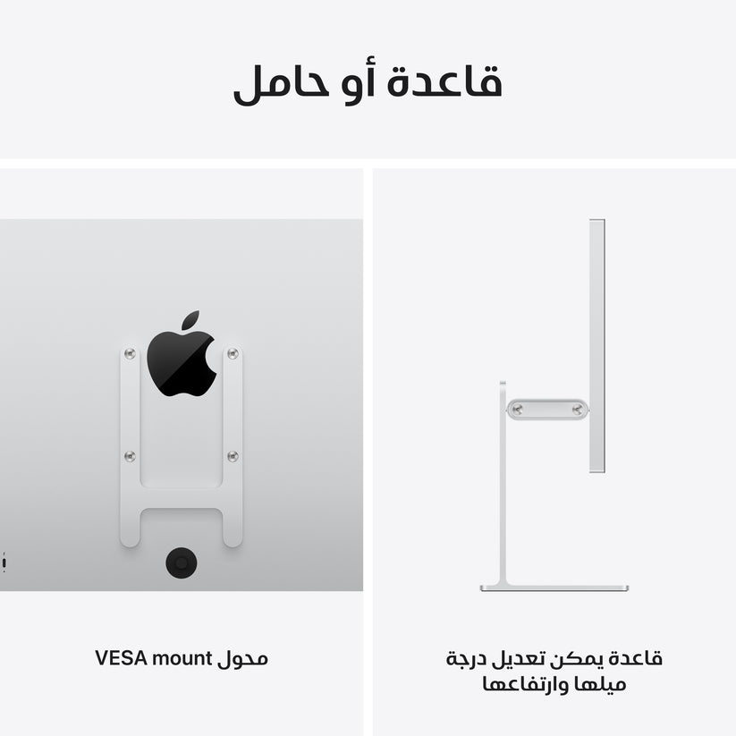 قاعدة مرفقة — تأتي شاشة Studio Display XDR بقاعدة يمكن تعديل درجة ميلها وارتفاعها مع تعديل ميل الشاشة بمعدل 30 درجة وتعديل ارتفاعها إلى 105 مم. يتوفر أيضاً محول VESA Mount اختياري.
