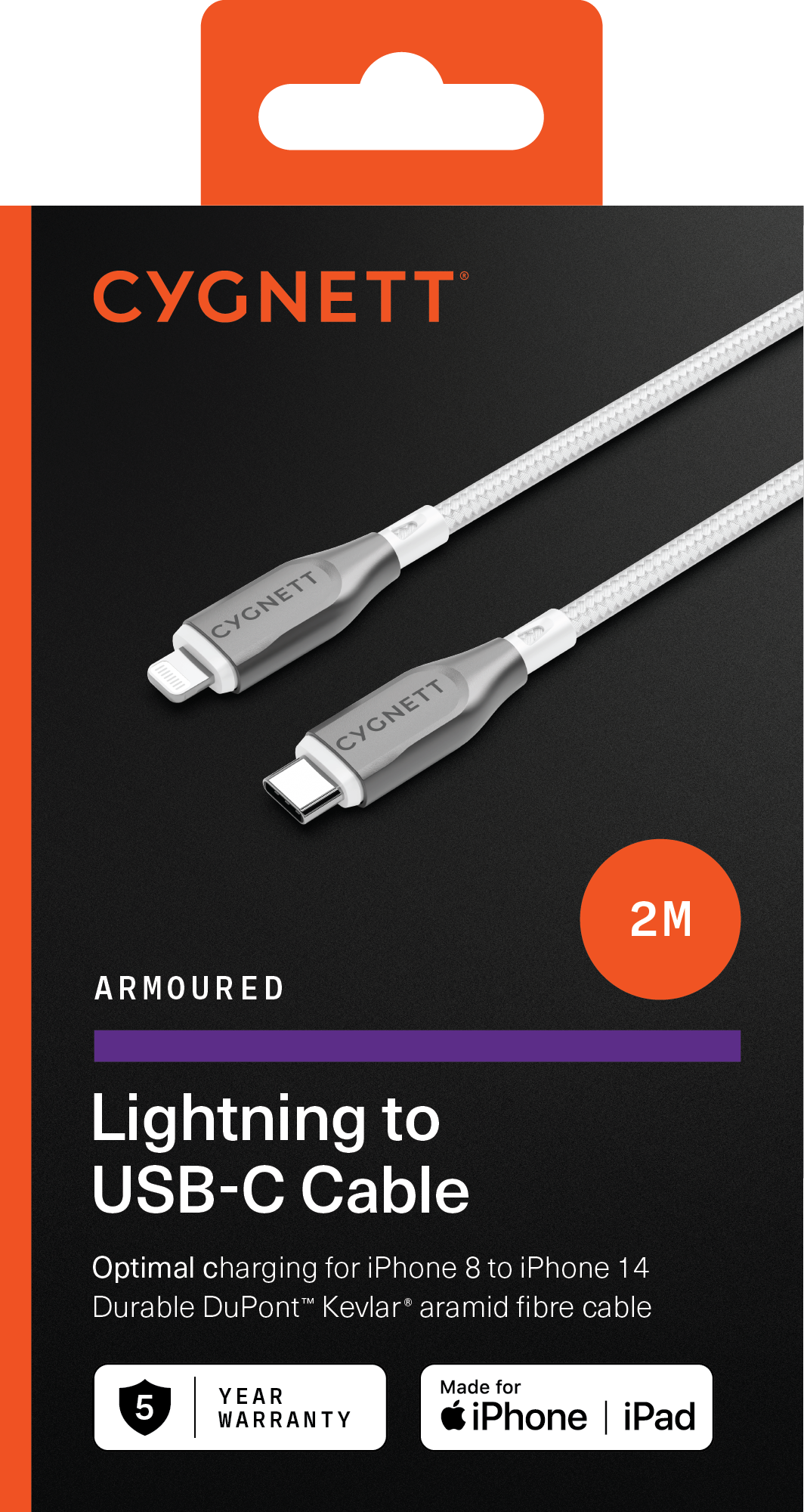 Fast charge your iPhone (30W), elongated cable connectors forged from a metallic alloy provide a refined aesthetic, strength, durability and superior scratch resistance made with double braided nylon with 5-year warranty.